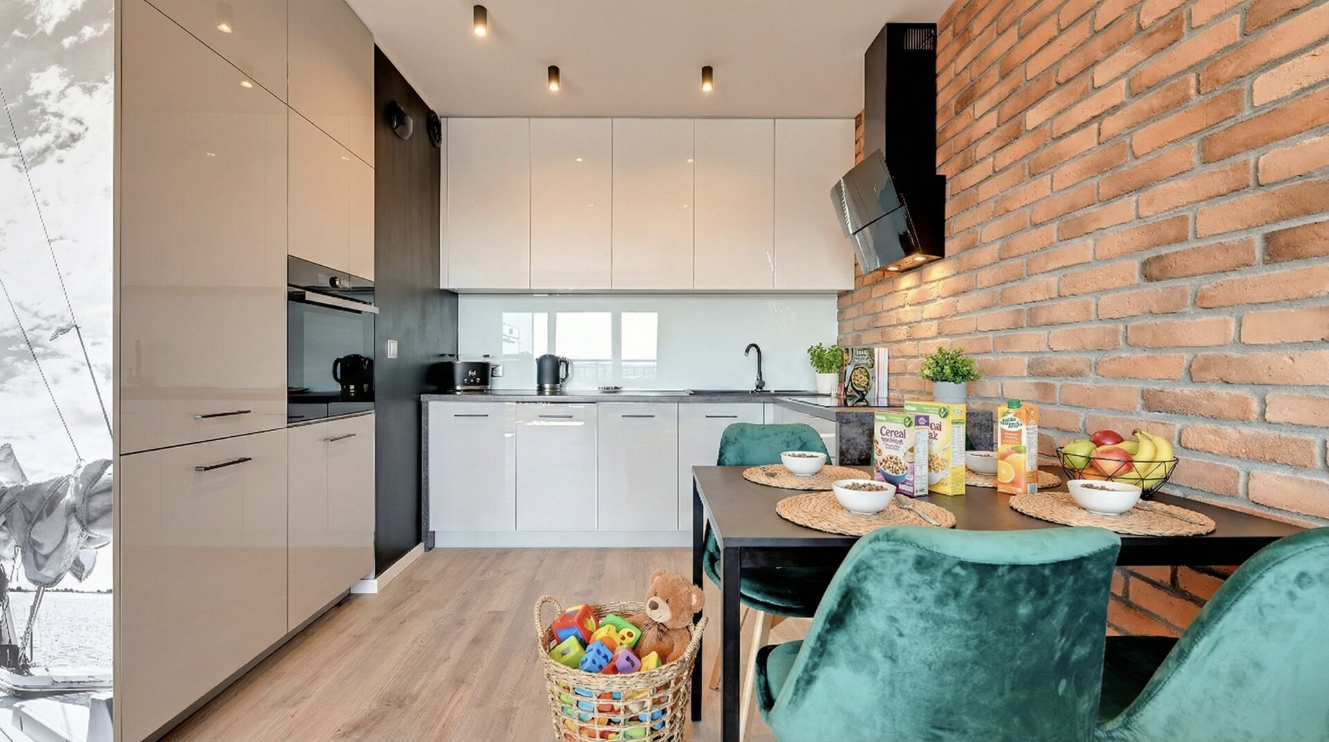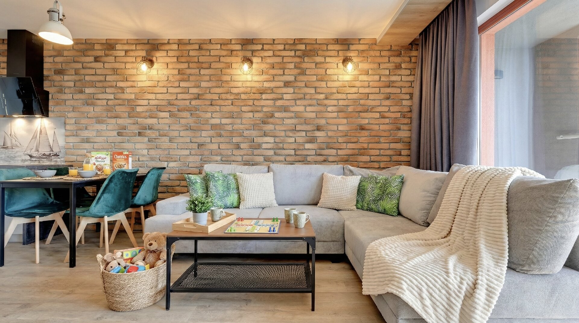 Sercem apartamentu jest rozświetlony salon połączony z dużym aneksem kuchennym. To tutaj, przy wspólnym stole, będziecie planować kolejne dni pełne przygód.